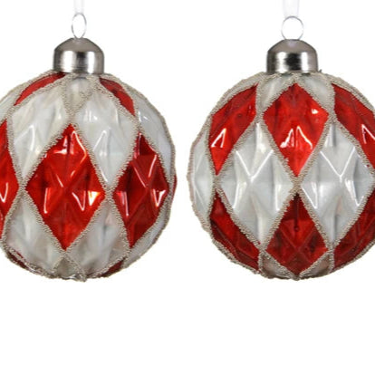 Red and White Harlequin Pattern Glass Christmas Tree Baubles