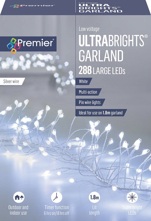 Premier Silver Ultrabright 1.8m Christmas Garland Pin Wire with 288 White LED Lights