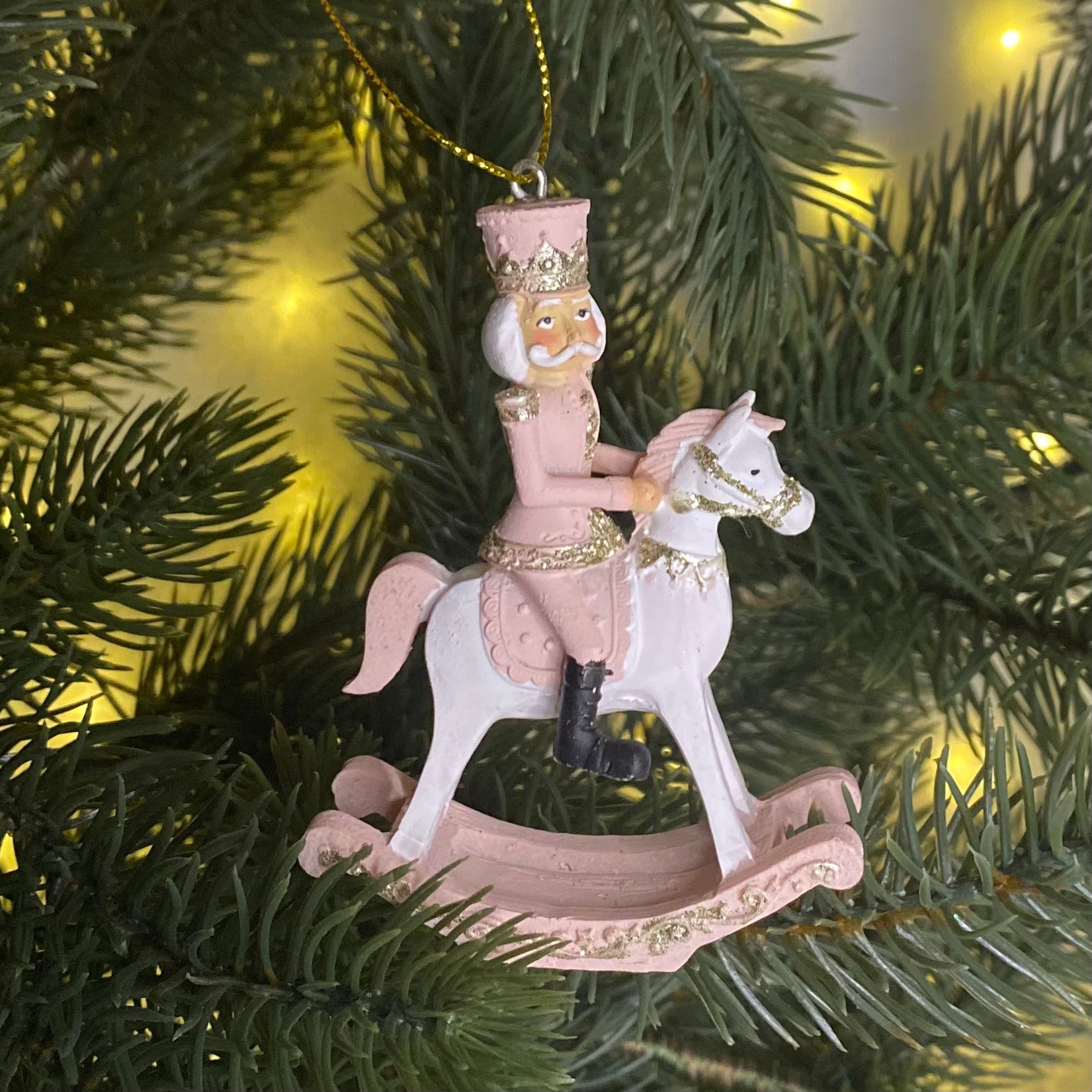 This wonderful noble pink nutcracker riding a rocking horse is totally enchanting. Perfect for hanging in the Christmas tree or anywhere you need a little Christmas.