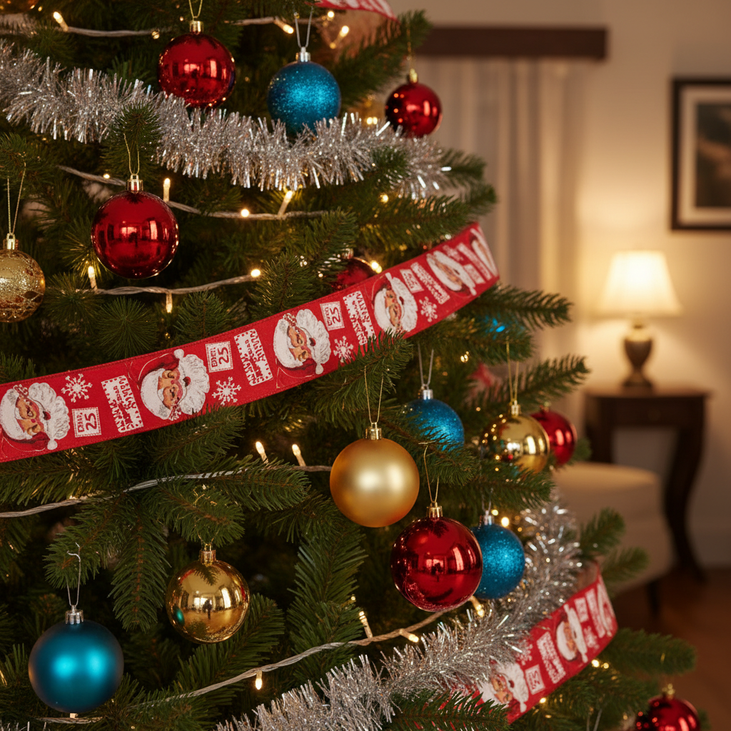 Add a touch of vintage elegance to your festive décor with our retro Santa Christmas Ribbon. Elevate your yuletide display and create a luxurious festive atmosphere with our opulent ribbon. Perfect for adorning Christmas trees, wreaths, and more.