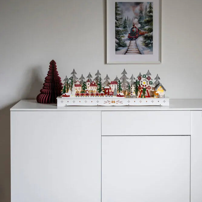 Imagine the warm glow of this charming German-style wooden decoration brightening your home this festive season. Showcasing a magical village nestled in a pine forest, it features magical train and Ferris wheel. This delightful scene brings a touch of festive whimsy and lights up any space with cozy, festive cheer—perfect for creating a magical Christmas atmosphere everywhere you place it.